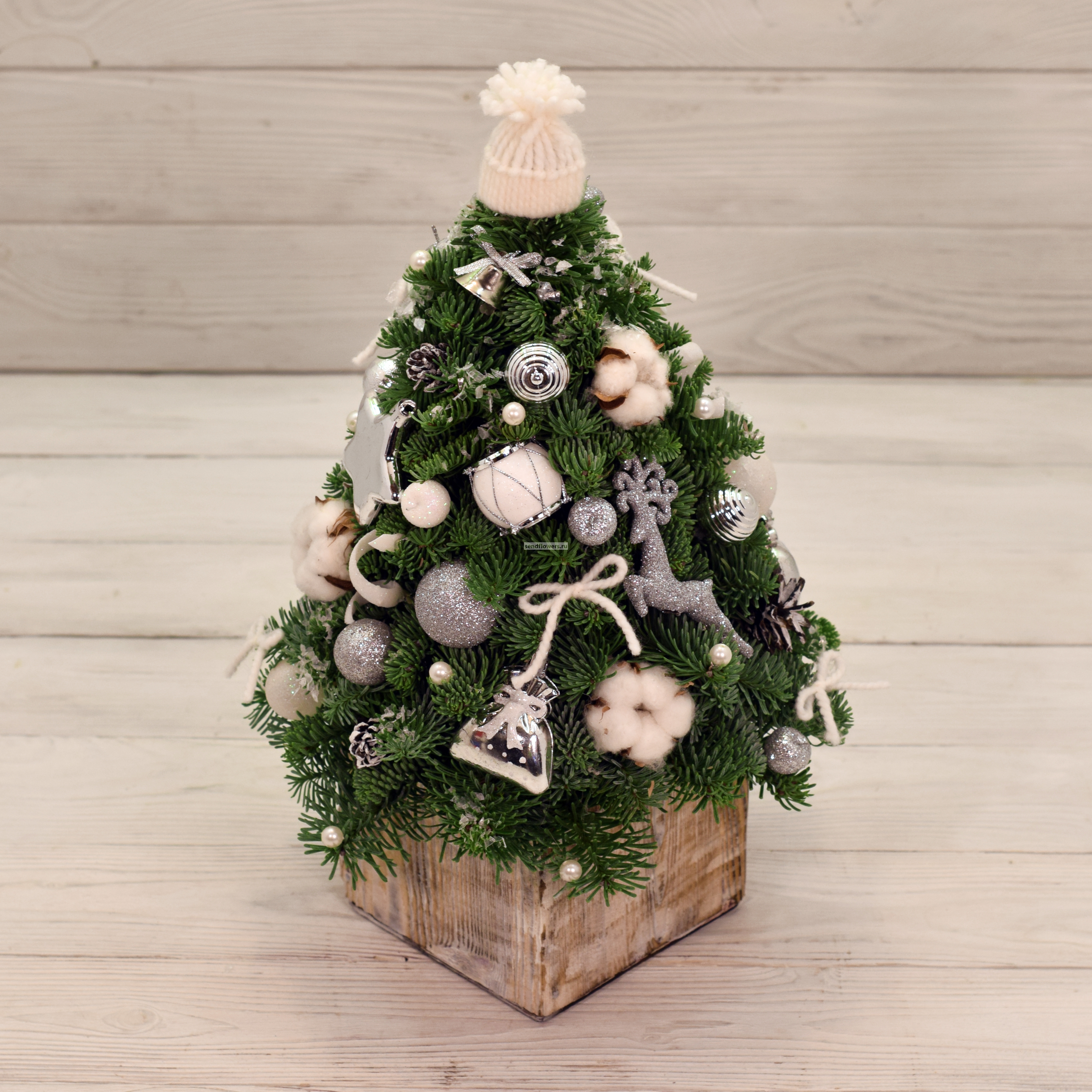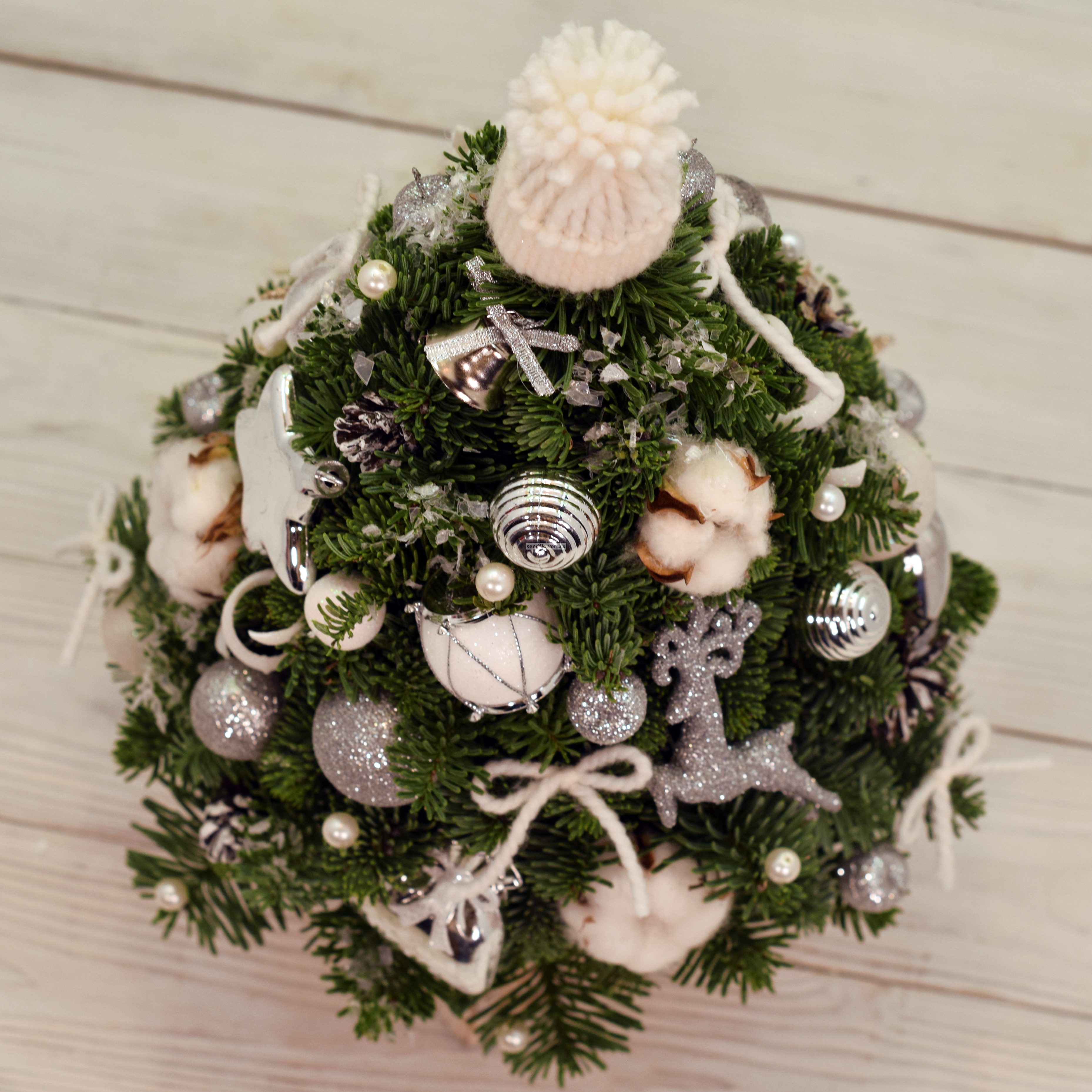 Состав: нобилис, белые игрушки. Высота композиции - 35 см. Доставляется в картонной коробке.